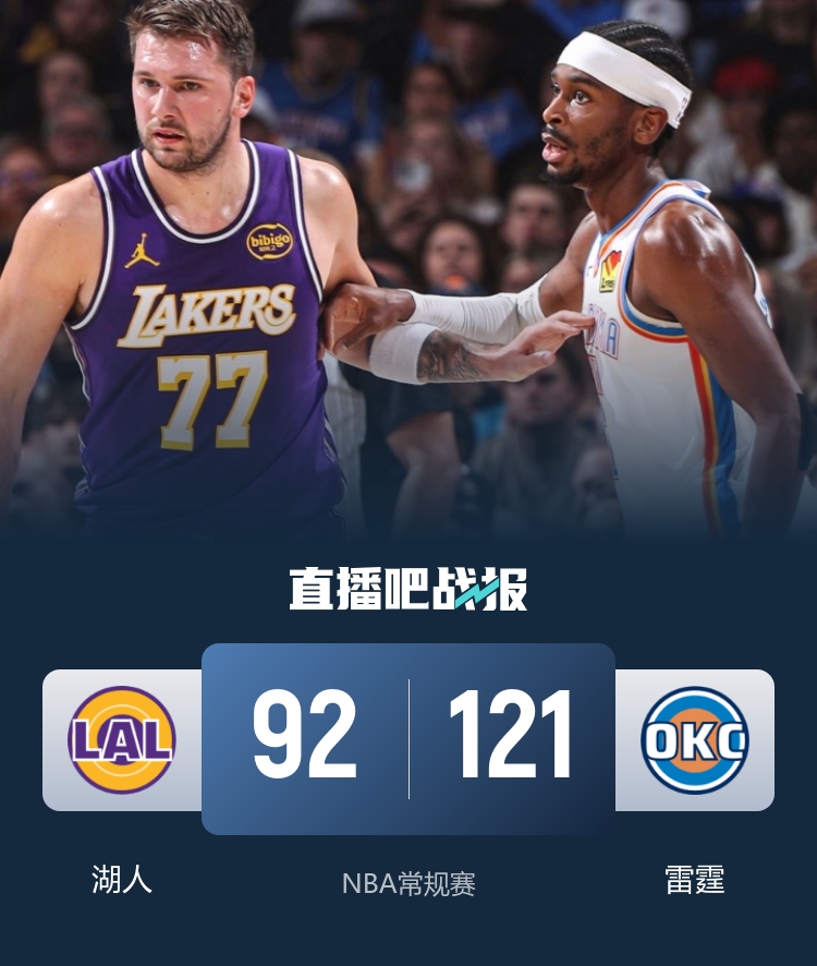比赛开局,两队先是交替取分,但很快湖人进攻端出现断电,雷霆继续稳扎稳打首节结束以30-18领先。次节场上形势延续,湖人半场出现11次失误,雷霆接连取分分差继续拉大,半场结束已经70-38领先到30分以上。易边再战,雷霆手感有所冷却,但湖人这边三分手感也不佳,没能抓住机会缩小分差,随后亚历山大连续进攻单节12+5稳住场上形势,三节结束雷霆100-64依旧领先30分以上。末节开战,湖人主力再战5分钟后分差没能缩小,湖人换上替补阵容,比赛结果盖棺论定,最终雷霆121-92大胜湖人,取得四连胜。