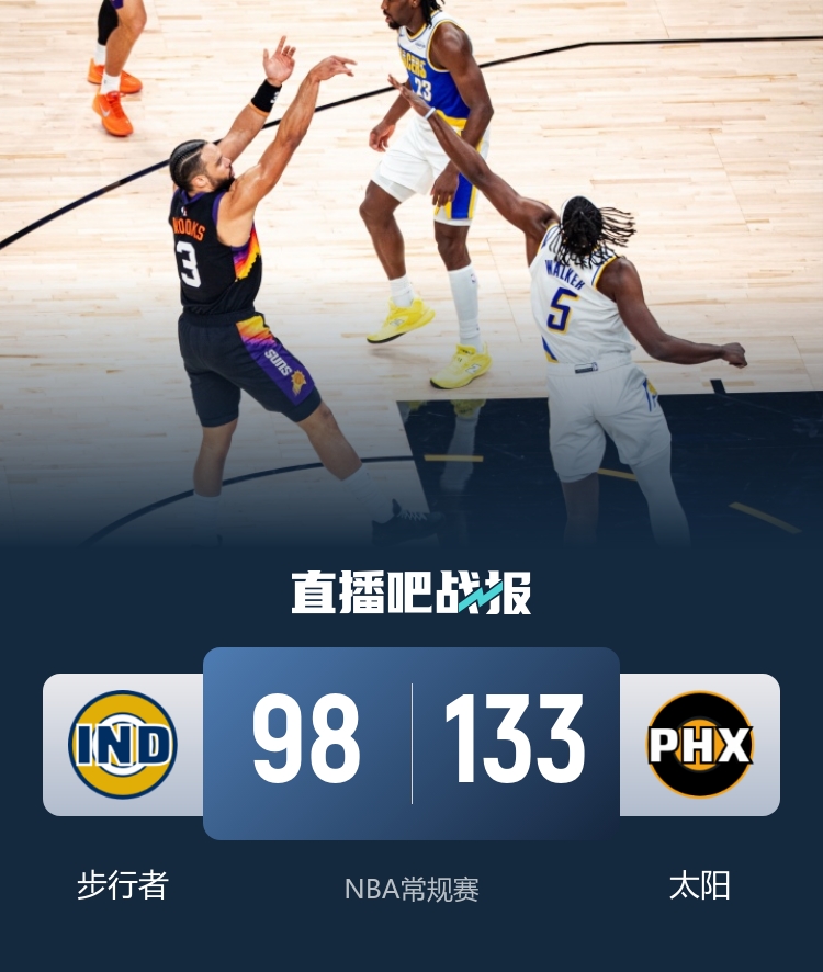 比赛开始,双方上来很快陷入拉锯战,狄龙里突外投状态不错很快得分上双,太阳顺势建立主动权,首节太阳领先8分,次节阿伦连续突破取分助太阳扩大领先,西亚卡姆连续杀伤追分,布克单节上双,狄龙半场轰下24分,太阳半场领先18分。下半场,双方展开拉锯战,内史密斯受伤离场,内姆哈德和西亚卡姆苦苦支撑,但布克连砍10分带队拉开20分以上领先,末节太阳上来20-0直接领先到40分以上,双方练兵,最终太阳133-98大胜步行者,拿到5连胜同时送对手6连败。