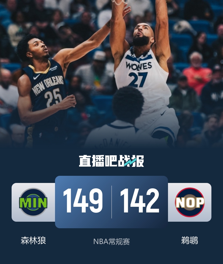 此役一上来两队短暂试探,戈贝尔内线攻防一体,爱德华兹连投带罚续上火力,费尔斯连续取分短暂回应,首节结束时森林狼领先6分,次节回来,墨菲突然发力单节独得11分,末段森林狼进攻断电,鹈鹕一波13-3后来居上,半场战罢,鹈鹕反超10分。短暂休整后两队拉开对攻,爱德华兹单节狂揽19分率队蚕食分差,三节结束后森林狼追至只差3分,末节上来,两队鏖战至最后时刻,爱德华兹关键上篮绝平,奎因绝杀未果后进入加时,兰德尔连续单打得手,森林狼一波8-0确立胜势,最终森林狼149-142击败对手迎来三连胜,同时送给鹈鹕4连败。