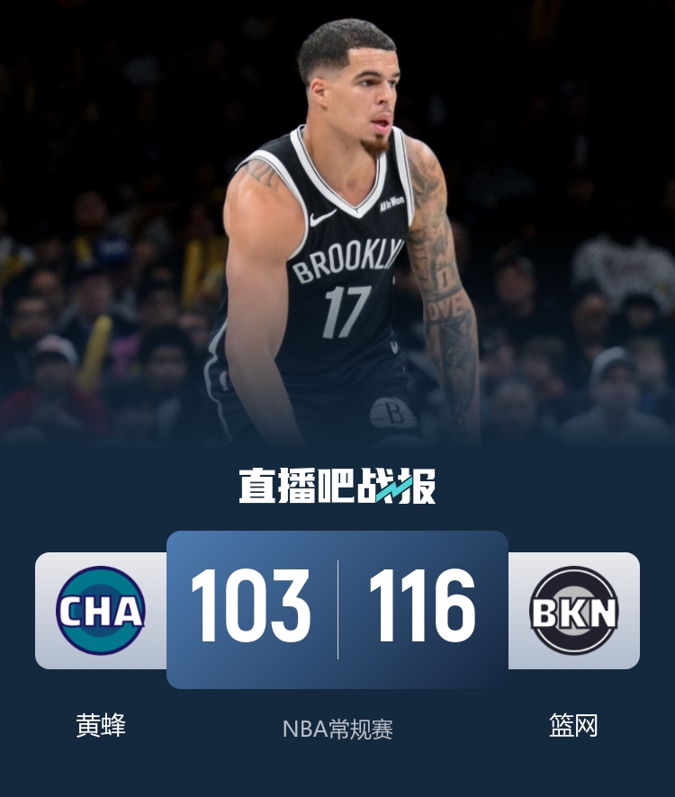 上半场,黄蜂率先发力打出10-4的开局,篮网内外开花迅速反超,鲍尔传射建功,波特高效输出予以回应,次节双方展开对攻,黄蜂轮番冲击内线频频得手,波特联手克洛尼飙中4记三分还以颜色,半场战罢双方打成59平。下半场,两队继续缠斗,篮网多点开花,萨隆和鲍尔相继三分穿针夺回优势,末节黄蜂后劲不足,篮网趁势打出12-0的攻击波获得两位数领先,黄蜂大势已去无力回天。最终,篮网116-103击败黄蜂,结束了自己的4连败。